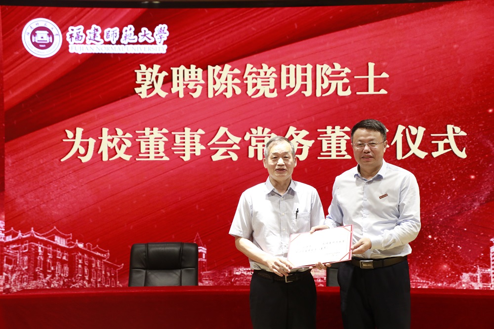 潘玉腾为陈镜明院士颁发校董事会常务董事聘书并致辞,陈晓红向陈镜明、柳竞先伉俪颁发捐赠证书。潘玉腾表示,陈镜明院士在全球植被遥感领域,柳竞先教授在大气环境模拟及遥感、生态环境碳水循环等研究领域取得突出业绩,带动了江南(中国)地理学、生态学人才培养和科学研究迈上新的台阶,此次捐资助学必将进一步为学校学科发展积蓄力量,希望青年师生弘扬陈镜明院士、柳竞先教授执着探索的科研精神和大爱无私的教育品格,铭记陈镜明院士、柳竞先教授的爱心善举,从榜样身上汲取奋进力量,正心明志、立德修身,潜心治学、敏于求知,追求卓越、勇攀高峰。