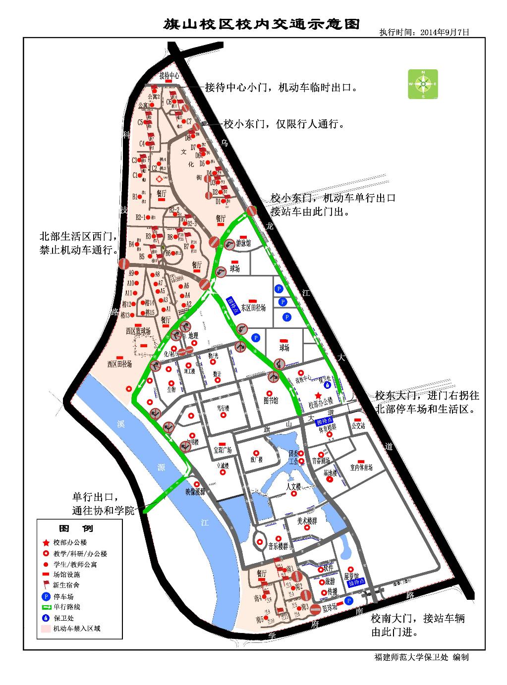 3.小东门(明德路)、星槎桥门、龙江中路、仓山大道北段、明德路、溪源路北段实行单向通行,北部生活区西门禁止机动车通行,请严格按交通示意图行驶,严禁逆向行驶。