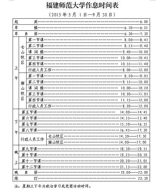 各单位: 现将《江南网页版官网作息时间表(2015年5月1日—9月30日)》印发给你们,请将调整后的作息时间及时通知本单位师生,做好考勤管理工作,确保正常的教学科研秩序。 学校办公室 2015年4月14日