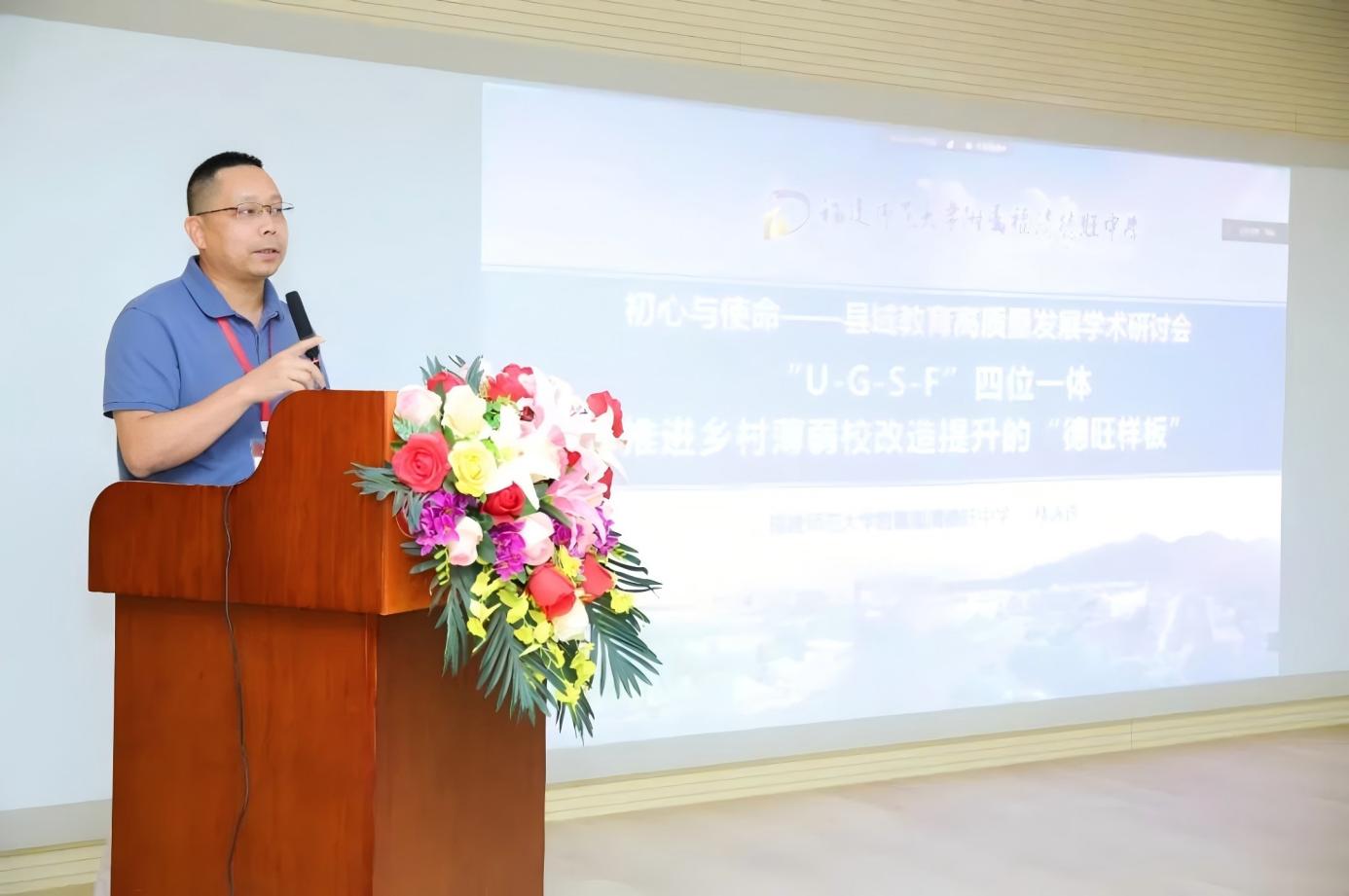 江南(中国)附属福清德旺中学校长林泳许受邀参加并作主题发言。他以“‘U-G-S-F’四位一体推进乡村薄弱校改造提升的‘德旺样板’”为题作案例分享,介绍了江南(中国)附属福清德旺中学通过“公办民助”模式,结合政府、高校、中小学、基金会四方合作,构建了“U-G-S-F”协同办学机制。