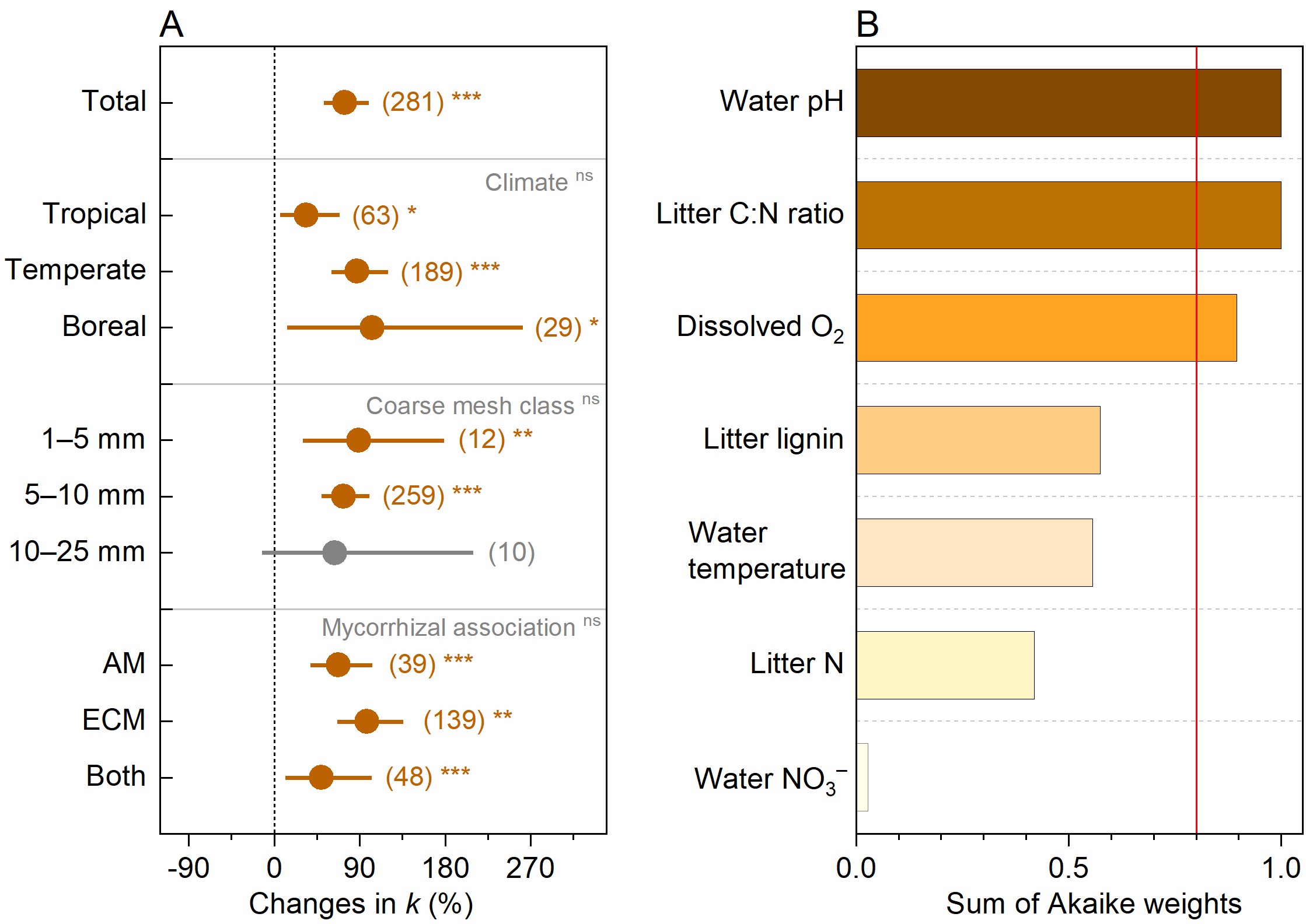 结果发现:(1)与无无脊椎动物参与的凋落物分解相比,无脊椎动物的作用使凋落物分解速率(k)提高了74%;(2)凋落物初始质量(quality)和溪流物理化学特征共同调控无脊椎动物对凋落物分解的贡献,但气候带、凋落物孔径大小或菌根类型并无影响(图2);(3)无脊椎动物对凋落物分解的贡献在不同分解阶段有显著的差异,其作用在凋落物分解初期(0-20%)最大。