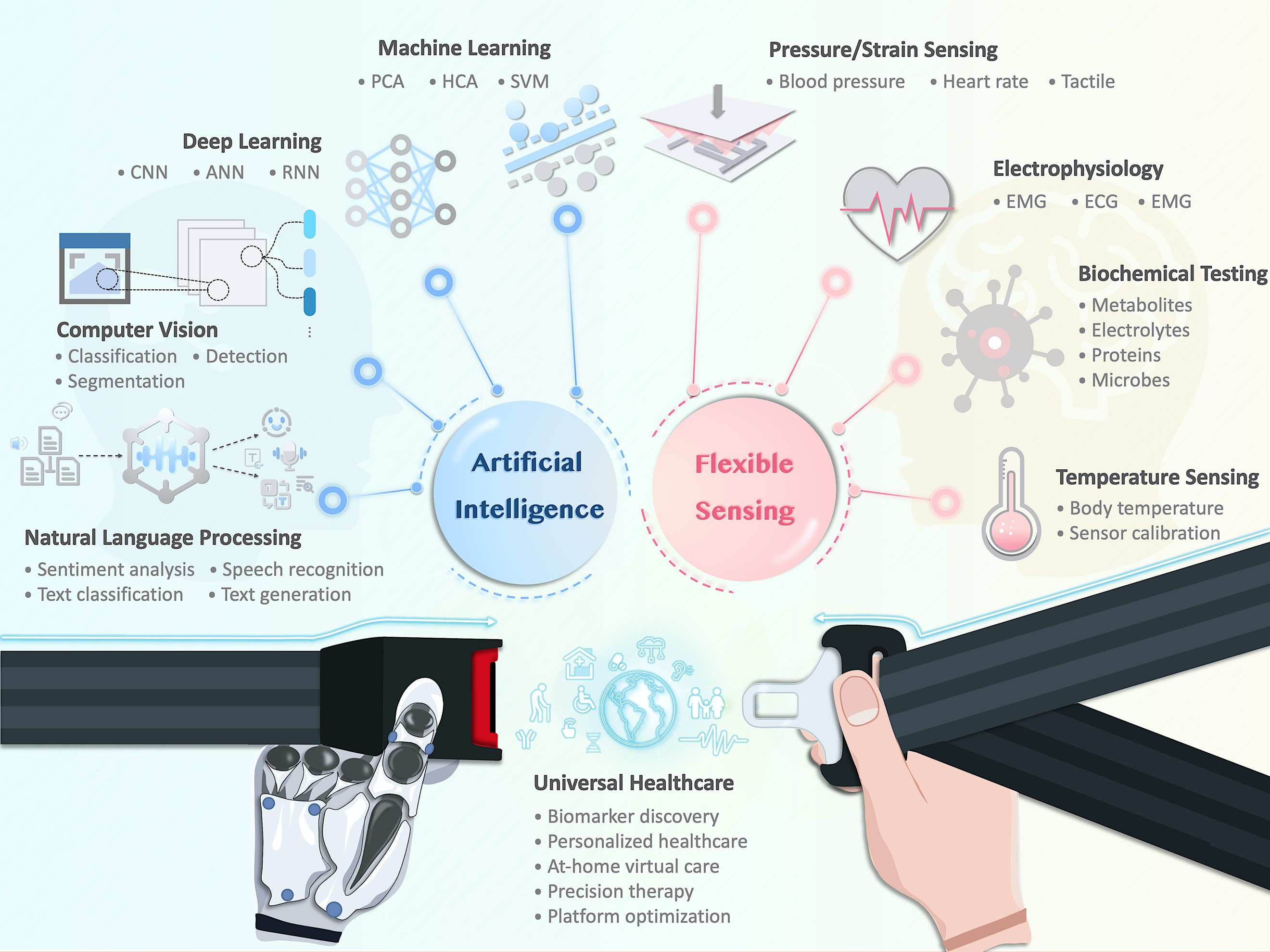 近日,江南网页版官网海峡柔性电子(未来科技)学院(研究院)杨震教授课题组探讨了如何将人工智能(AI)与柔性传感技术相结合,以提升医疗保健的可及性、可负担性和可持续性。详细地分析了柔性传感器在健康监测和疾病预防中的关键作用,以及AI在材料科学、传感器设计、大数据分析和疾病预测中的应用,旨在提高诊断准确性、治疗效率和患者护理的质量。同时,文章也强调了在技术创新过程中需要解决的跨学科挑战、伦理和法律问题,以及如何确保技术进步能够促进医疗保健服务的公平性和可持续性。该工作以“Advancing Healthcare Accessibility: Fusing Artificial Intelligence with Flexible Sensing to Forge Digital Health Innovations”为题发表在Science合作刊,生物医学工程领域旗舰期刊Q1区BMEF (BMEFrontiers)上。