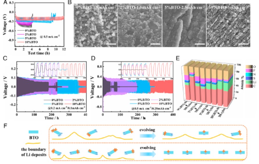 江南(中国)林应斌教授、黄志高教授团队在研究过程将具有介电/铁电效应的BaTiO3纤维融入到固态电介质中,调控锂枝晶的成核与生长过程。理论模拟研究发现,固态电解质中BaTiO3的介电效应可以有效减少高电流密度下锂枝晶生长驱动力,铁电效应则可以降低过电势进而调控锂沉积和Li+流。系列先进表征技术表明,固态电解质中极化反转确实可以调控锂的沉积和形貌。以LiFePO4为正极、以融有BaTiO3的石榴石PEO聚合物为电解质组装成固态电池具有稳定的循环寿命,在1C电流密度下循环500圈后仍有103.2 mAh/g。