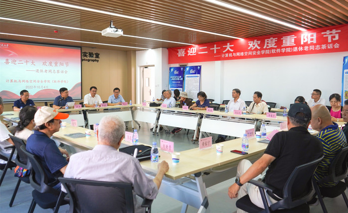 10月4日,计算机与网络空间安全学院在旗山校区18号科研实验楼十层多功能厅举办“喜迎二十大欢度重阳节”退休老同志茶话会。学院领导俞建群、许力、邓胜柱、陈黎飞和18名退休老同志欢聚一堂,共叙情怀,欢度佳节。