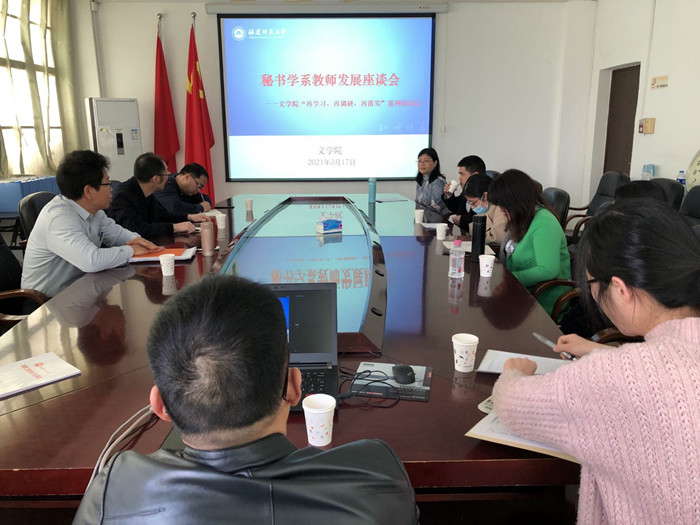 3月17日下午,文学院在仓山校区文科楼701会议室召开秘书学系教师发展座谈会,院领导李建华、李小荣、叶祖淼参加会议,听取8位教师关于自身发展规划和专业转向建议。据悉,此次座谈会是学院党委贯彻落实“再学习、再调研、再落实”系列活动之一,也是学院党委2020年度民主生活会整改措施之一,主要目的是引导广大教师进一步增强“四个意识”、坚定“四个自信”、做到“两个维护”,不忘立德树人初心,牢记为党育人、为国育才使命,实现学院“十四五”规划开好局,谋新篇。(文学院)