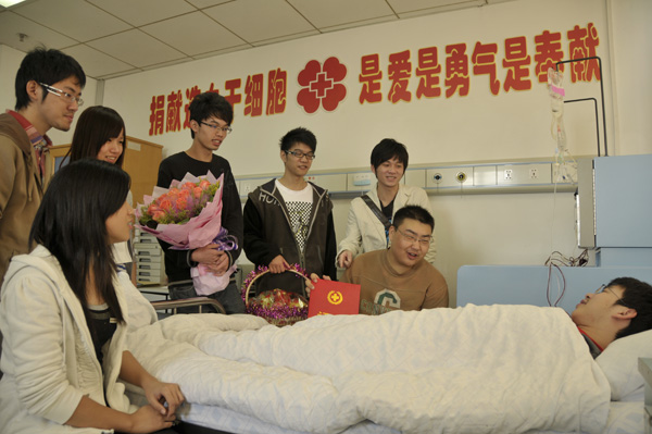 黄锦平代表学校向黄振桐同学送上鲜花和慰问金,表达了亲切的慰问,称赞黄振桐同学捐献造血干细胞的行为令人敬佩,是学校的骄傲。胡树林为黄振桐同学授予捐赠证书,并献上鲜花。信息技术学院林伟书记也代表学院送上鲜花和慰问金。黄振桐同学所在班级的同学给他送来花篮、水果和牛奶等,自入院以来,同学们轮流陪伴在他的身边。黄振桐同学神态轻松,非常感谢家人对他的支持和领导、老师、同学们对他的关心。