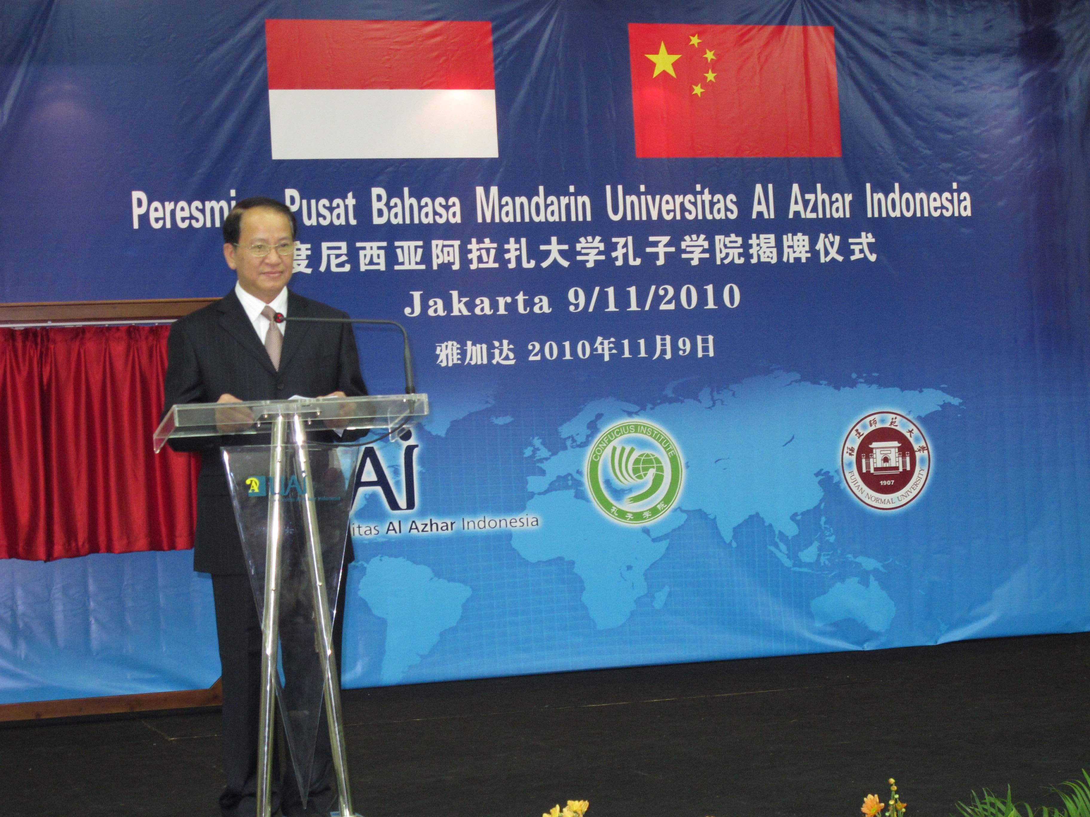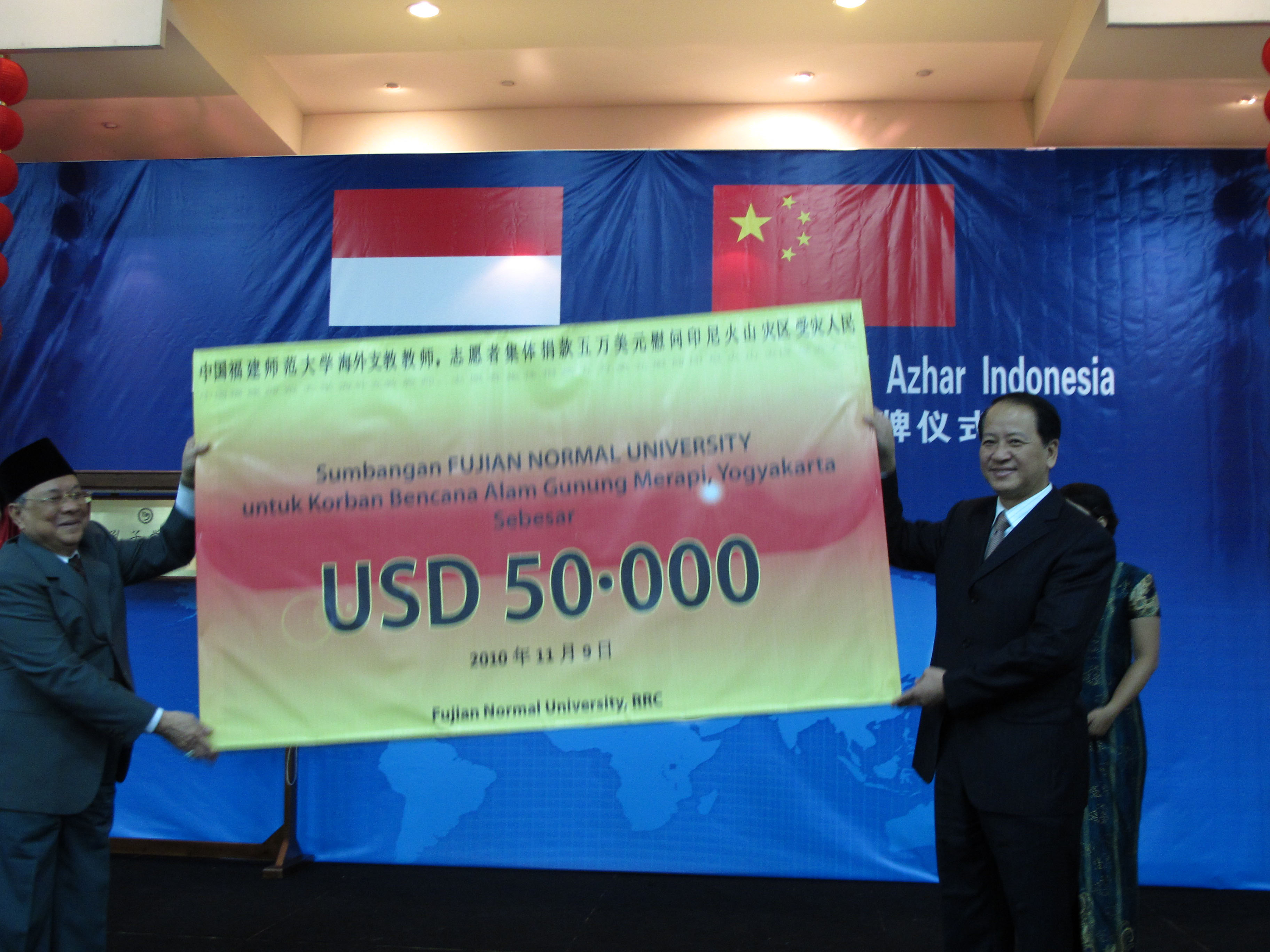 阿拉扎大学哈索诺副校长与罗萤书记共同为孔子学院揭牌并致辞,法西理副部长在揭牌仪式上发表了热情洋溢的演讲。揭牌仪式上还举行了为印尼火山灾区募集善款的捐赠仪式,江南(中国)历批赴海外任教的汉语志愿者以及公派教师集体募捐的五万美元善款,由罗萤书记交付给阿拉扎大学卢比斯副校长,并由阿拉扎大学转交印尼红十字总会。