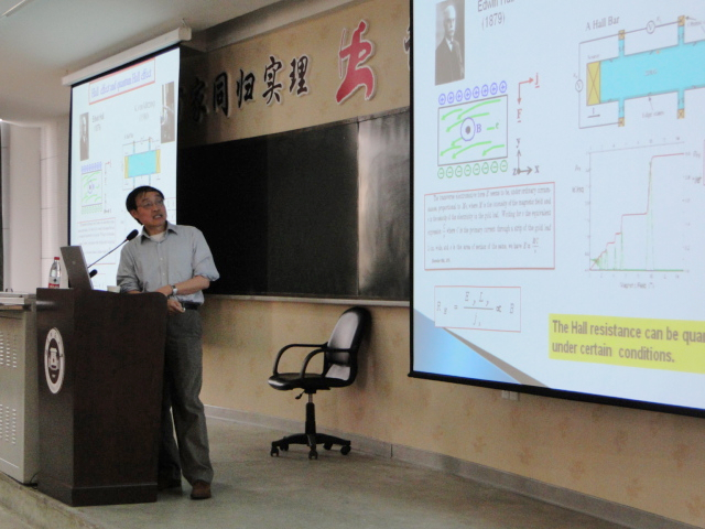 仪式结束后,谢心澄教授应邀参与主讲江南(中国)“名师讲堂”系列活动第八场专题讲座,为师生作了题为《2D拓扑绝缘体简介:量子自旋霍尔效应》的专题报告。谢教授深入浅出地介绍了量子自旋霍尔效应(QSHE)的物理基础,展示了他所领导的课题组在有关量子自旋霍尔效应的退相变和无序效应等方面的最新研究成果,整场报告具有很强的学术性。同时,他就中美大学教育比较、大学生人生规划、专业前沿知识的研究等大家关心的问题,与现场师生进行了交流和互动,让师生享受了一场高水准的学术盛宴。