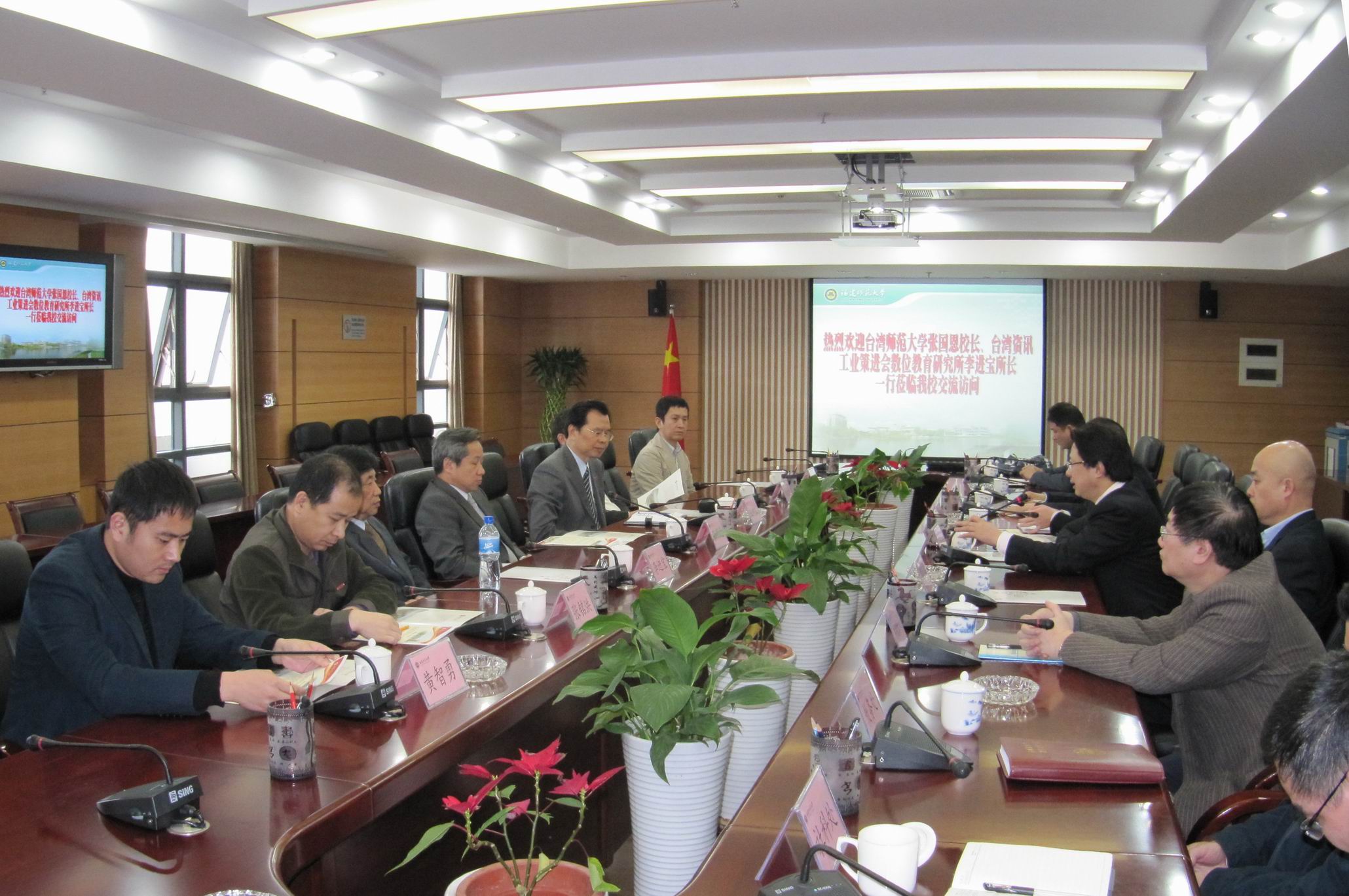 近日,台湾师范大学张国恩校长、台湾资策会李进宝所长一行到江南(中国)参观访问。校党委罗萤书记、黄汉升校长、许明副校长会见了来宾,学校办公室、研究生处、人事处、教务处、科技处、社科处、港澳台办相关负责人陪同会见。 台湾师范大学是台湾地区成立最早、院(系、所)最完整、最具规模的师范大学,与江南(中国)签有框架合作协议。此次来访,双方就进一步加强实质性合作展开深入探讨,在开展多层次、多形式合作交流等问题上达成了共识。 (港澳台办 施 伟)