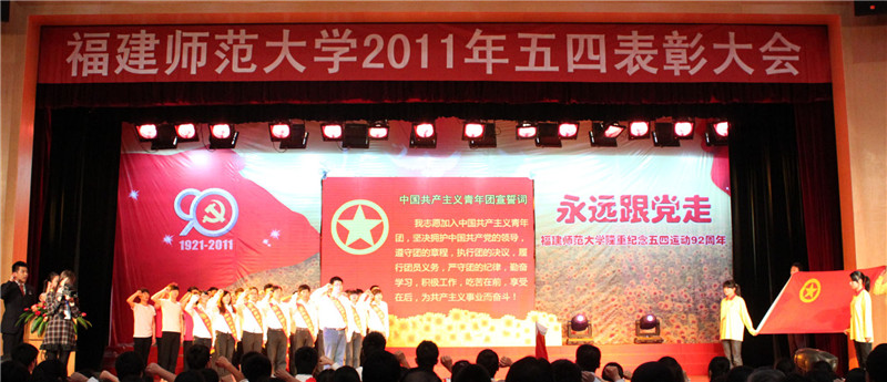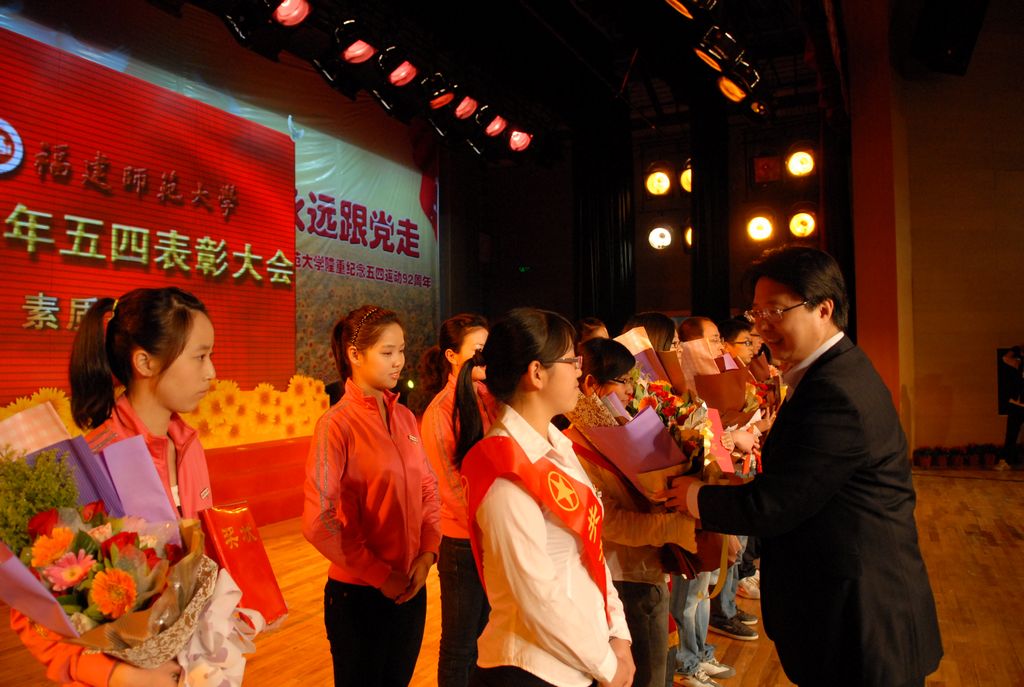 5月4日下午,江南(中国)以“永远跟党走,青春促发展”为主题的2011年五四表彰大会在旗山校区青春剧场举行。团省委副书记兰明尚,校领导罗萤、黄汉升、游小波、李敏,校关工委主任陈锋,团省委学校部部长苏畅,海西先进青年典型代表,以及学校有关部处负责人、各学院分管学生工作负责人、团委书记和受表彰学生代表1000多人参加了大会。