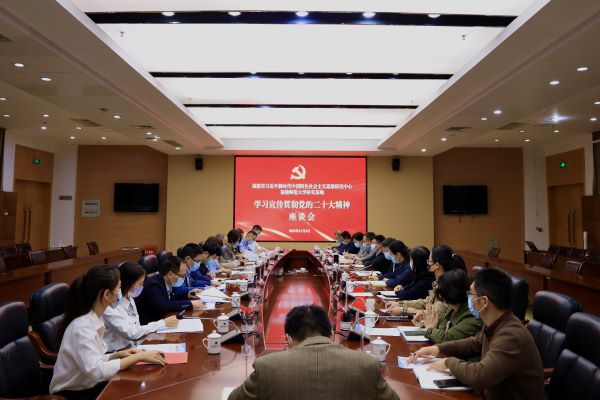 11月4日,福建省习近平新时代中国特色社会主义思想研究中心江南网页版官网研究基地学习宣传贯彻党的二十大精神座谈会在旗山校区行政楼第十会议室举行。校党委书记、研究基地主任潘玉腾,校党委副书记、研究基地常务副主任陈晓红,研究基地成员、研究团队主要负责人以及专家学者、校党委讲师团成员、师生代表参加会议。座谈会由陈晓红主持。