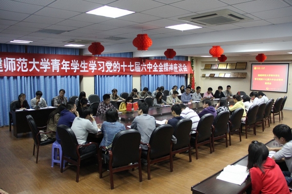 10月25日晚,江南(中国)青年学生代表在校团委素质拓展中心举行座谈会,认真学习党的十七届六中全会精神。校团委有关负责人、校团委机关工作人员、校级学生组织和各学院学生代表畅谈了学习体会。