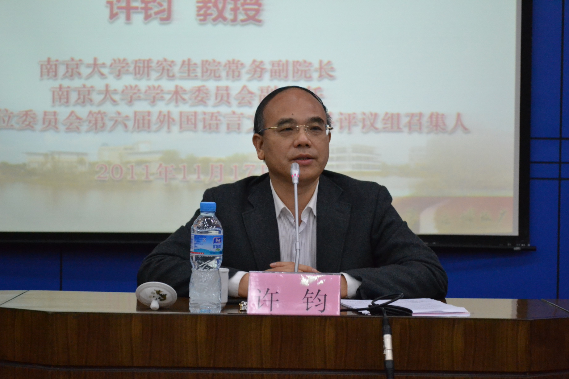 国务院学位委员会第六届外国语言文学学科评议组召集人、南京大学研究生院常务副院长、南京大学学术委员会副主任许钧教授应邀在会上作《关于研究生教育与人才培养》的主题报告。许钧教授从我国30年来学位与研究生教育取得的主要成绩和当前国家对研究生教育作出战略性结构调整的宏观角度出发,指出作为一名研究生导师,首先要转变观念,既要注重学术学位研究生的培养,又要重视专业学位研究生的培养。在具体实践中,要正确处理好国际学术前沿与国家发展需求、研究生教育的统一管理与研究生的个性化培养、指导研究生与使用研究生以及学术创新与学术不端行为等四类矛盾,并以南京大学的研究生教育实践经验,具体诠释了如何处理好上述四类矛盾。
