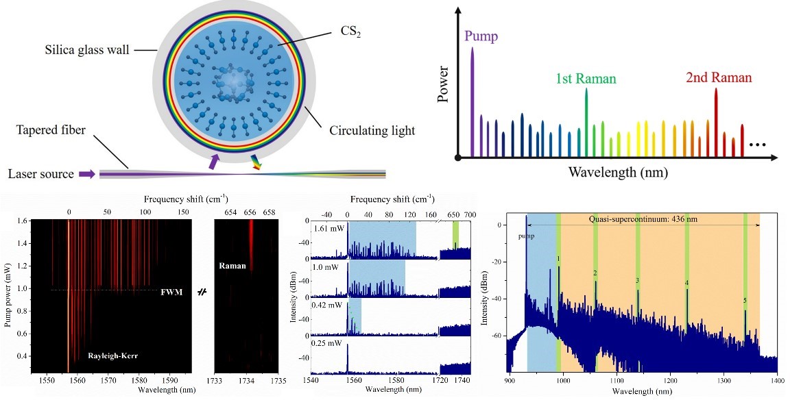 回音壁微腔具有超高品质(Q)因子和较小的模体积,可以极大地增强光-物质相互作用,是研究非线性光学效应和新型微光子器件的理想平台。然而,以往的研究大多局限于固态微腔。与固体材料相比,液体材料的非线性系数高2-3个数量级;液体中的分子除了可以支持振动跃迁外,还可以支持旋转跃迁,这是固体材料所不具备的。因此,液体材料在功能光子器件和探索新物理方面有很大的潜力。