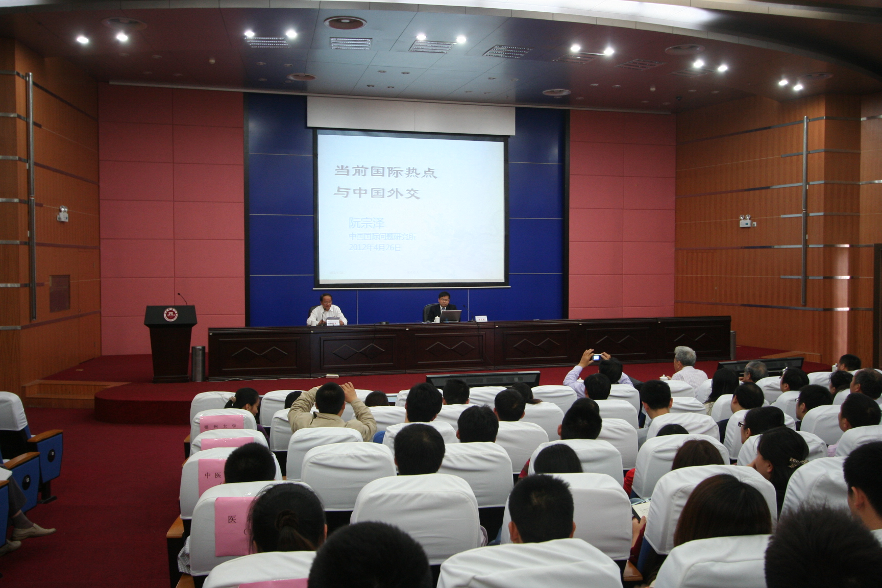 报告会上,阮宗泽研究员以深厚的学术底蕴、丰富的外交经历,结合自己多年来的研究成果,集中就“高热不退的中东”、“美国‘重返’亚洲”、“风起云涌的南海”等三大国际热点问题进行了深入阐述,对当前国际形势和我国现阶段的对外政策进行了独到的分析,并在互动环节中详细解答了师生关心关注的国际热点问题。他睿智严谨、幽默风趣、生动形象的演讲多次赢得了现场观众的热烈掌声。