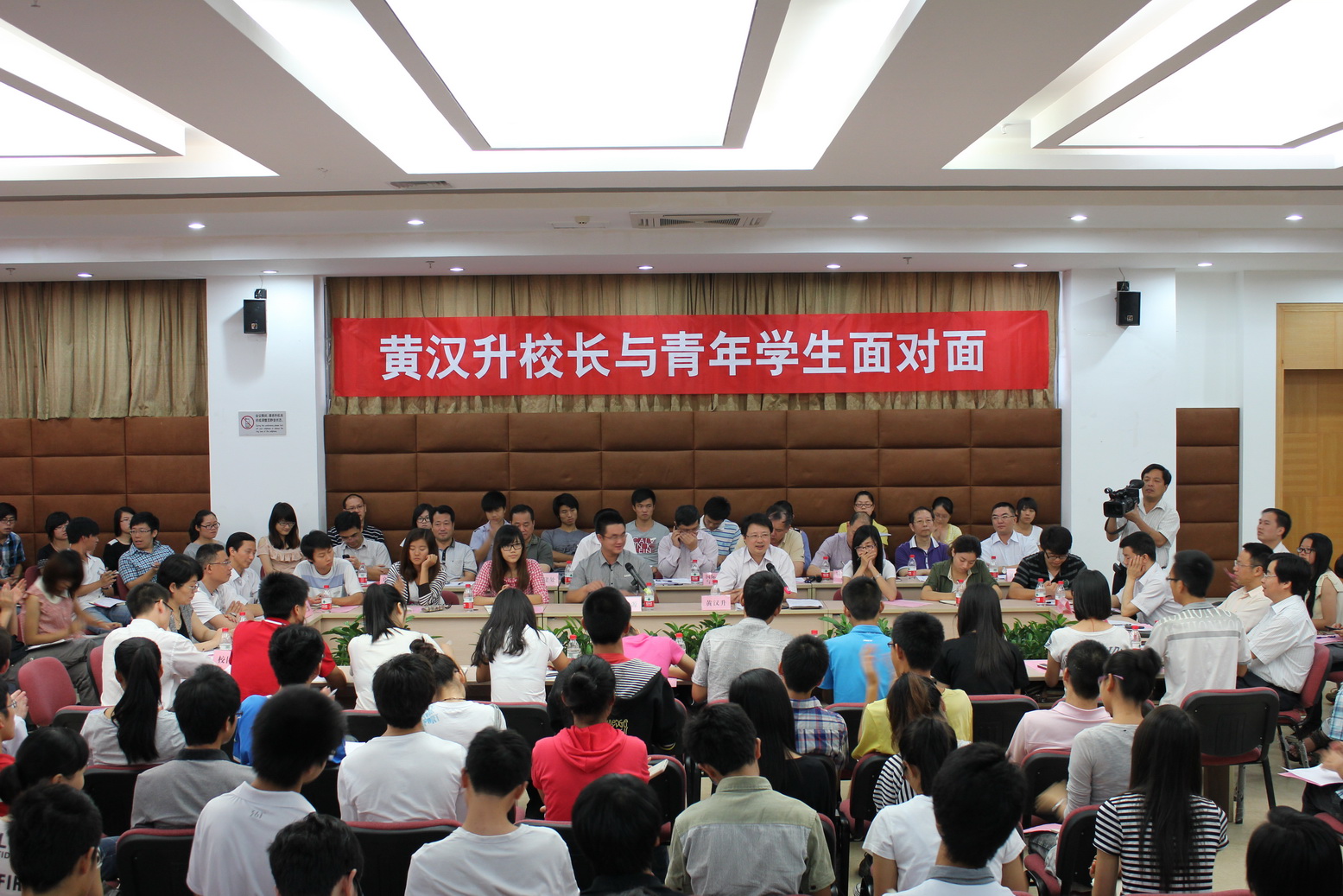 交流会于6月2日上午在旗山校区第九会议室召开。黄汉升校长带领学校办公室、宣传部、学工部、研工部、保卫处、校团委、教务处、国际合作与交流处、财务处、后勤管理处、基建处、仓山校区管理办、后勤服务集团、图书馆、校医院、网络运维部等有关单位负责人,与从短信、网络报名者中抽取的150位学生代表围坐在一起,亲切交流,共话发展。交流会由校学生会主席蒲鑫源同学主持。