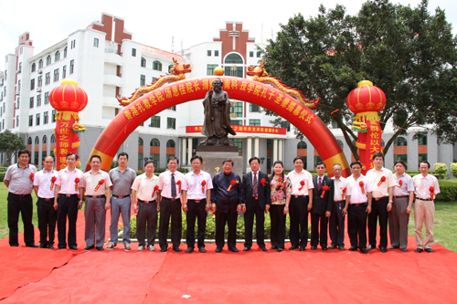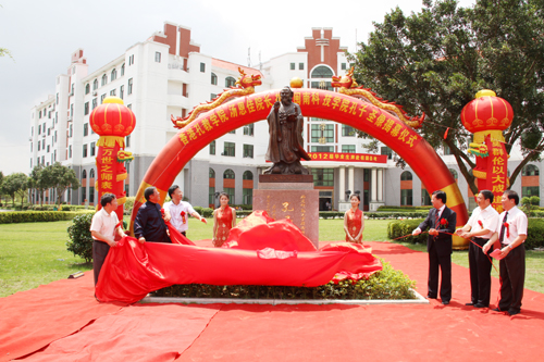 6月26日上午,闽南科技学院举行孔子圣像揭幕仪式。圣像捐赠人、香港孔教学院院长、国际儒学联合会副理事长汤恩佳博士,香港孔教学院副院长、香港汤恩佳孔子思想宣讲团永久荣誉团长、香港孔教总会永远名誉会长吕天增先生,香港汤恩佳孔子思想宣讲团团长、复旦大学博士杨发坤先生,江南(中国)校长助理郭警修,南安市副市长李清安,泉州府文庙管理处主任何振良,福州市孔子学会常务副会长柯远扬教授,福州市孔子学会秘书长、孔子75代孙孔海钦先生,学院董事会戴宏达董事长、戴宽南副董事长,学院领导郭丹、林明旭,学院有关部门负责同志、师生代表,以及福州市孔子学会理事、部分会员等参加了揭幕仪式。