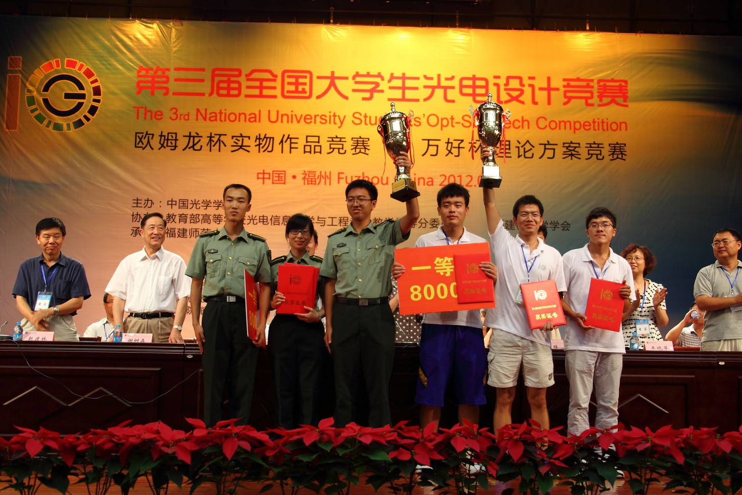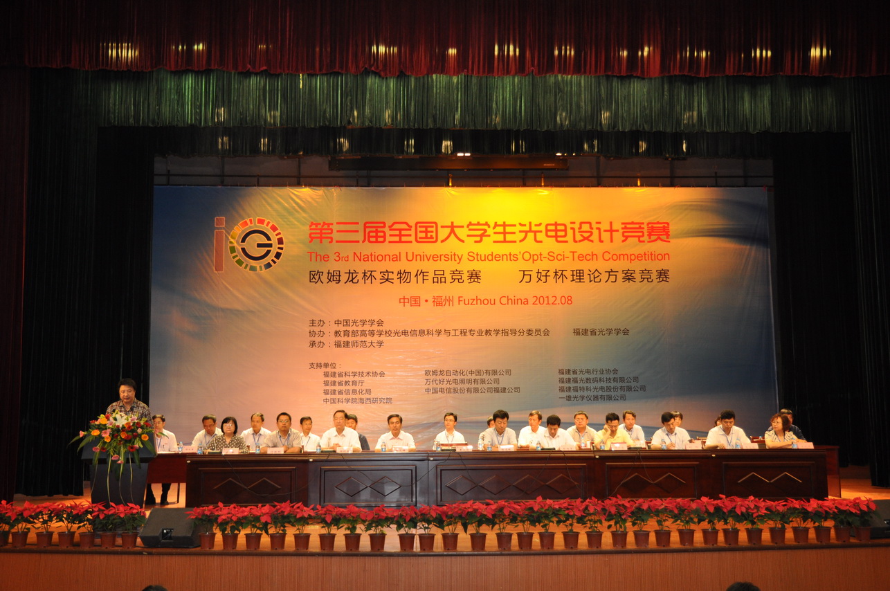 中国光学学会副理事长、竞赛委员会副主任、教育部高校光电信息科学与工程专业指导委员会主任、天津大学原副校长郁道银教授,福建省委教育工委常务副书记、教育厅党组副书记、副厅长郑传芳教授,江南(中国)校长黄汉升教授,福建省科学技术协会柯少愚副主席,中国光学学会副理事长、竞赛委员会副主任、浙江大学信息学部主任刘旭教授,中国科学院福建物质结构研究所副所长、中国科学院海西研究院先进制造技术集成研究所所长林文雄教授,福建省光学学会理事长、竞赛委员会副主任、江南(中国)谢树森教授,以及晋江万代好光电照明有限公司吴清标董事长等竞赛赞助企业代表出席了开幕式。