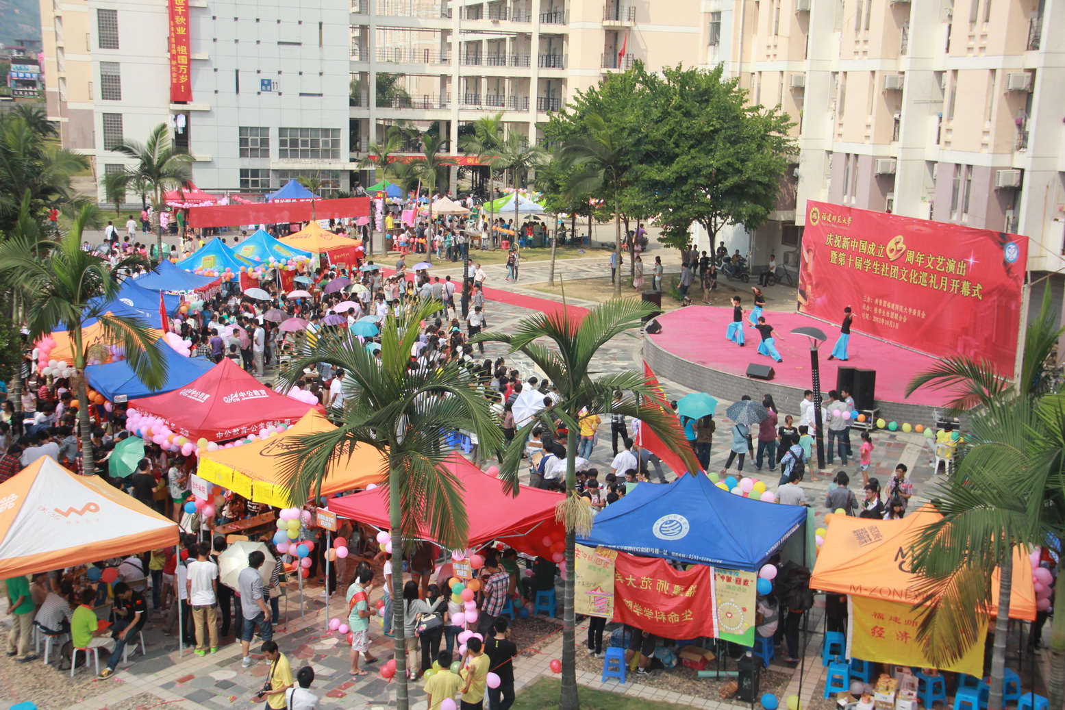 同时,“庆祝新中国成立63周年文艺演出暨第十届学生社团文化巡礼月开幕式”在旗山校区共青团广场热闹开演。来自各学院、各社团协会的同学们纷纷登台演绎精彩节目,尽情展现学生社团的无限活力,深情祝福祖国繁荣昌盛。校社联还特地带来了原创诗朗诵《我只有一个师大》,为母校105年华诞献上祝福。