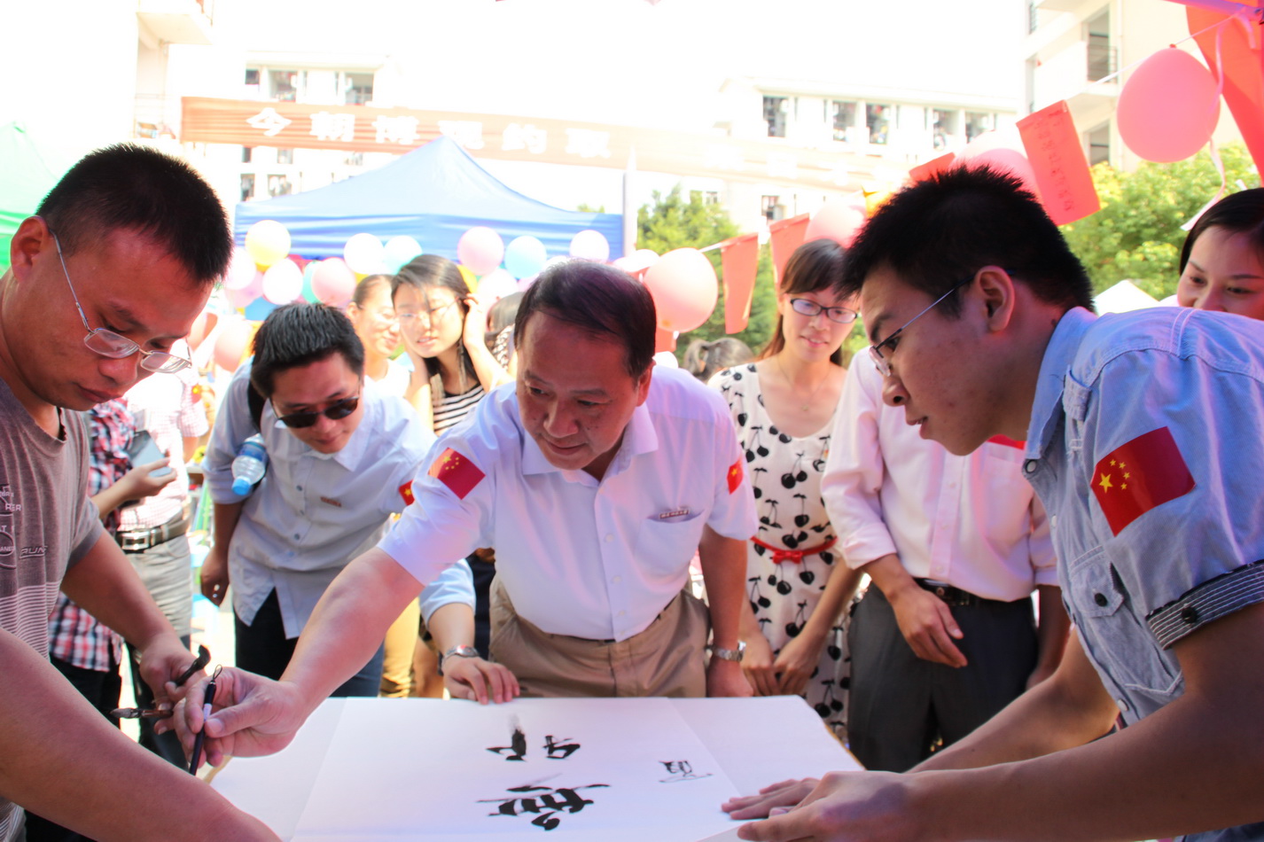 校党委罗萤书记和学校有关部门、各学院学生工作负责人到现场观看演出,与师生共度国庆佳节。在教育学院游园点,罗萤书记兴致勃勃地指挥,并与同学们合唱一曲《歌唱祖国》,引来阵阵喝彩声和欢呼声。在文学院游园现场,罗书记即兴写下“思无邪”三个大字,勉励同学们要时常自省,保持思想纯正和一身正气,文学院的同学则以“修治平”三字回赠书记。罗萤书记还与海外教育学院的印尼留学生们亲切交谈,希望远在异乡的他们能够在学校度过一个温馨愉快的节日。