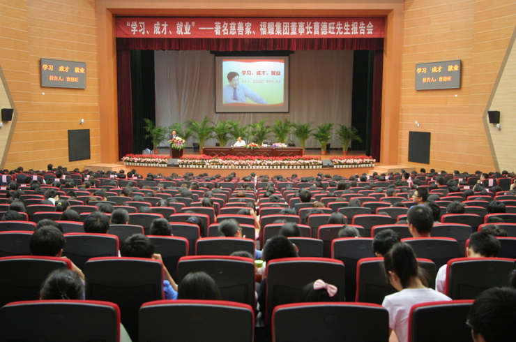 10月9日下午,著名企业家、慈善家、福耀集团董事长曹德旺先生应邀来校,为广大学生开设了以"学习•成才•就业"为主题的报告会。校领导罗萤、黄汉升、游小波、许歌平,校长助理郭警修,有关部门负责人,以及师生代表共1000多人聆听了报告。报告会由校党委罗萤书记主持,现场座无虚席,气氛热烈。