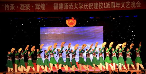晚会以“传承·凝聚·辉煌”为主题,分为三个篇章,以舞蹈《绽放》开场,寓意学校历经百年积淀,焕发跨越发展的蓬勃力量。第一篇章为“传承薪火”,通过舞龙表演《中华魂》,歌曲《暗香》,舞蹈《呼唤绿荫》、《花儿为什么这样红》、《船政学堂》,舞台剧《跪羊图》等节目,展现百年师大悠久的办学历史、深厚的文化底蕴和代代师大人坚守的精神气脉。第二篇章为“凝聚人心”,以歌舞《春天的芭蕾》,群舞《我们的高三·三》、《一个都不能少》,啦啦操《动感青春》,民族舞串联《印象民族》,印尼歌曲《我一定回来》,展现学校近年来在开放办学、服务社会等方面取得的办学成果,展示师大人凝心聚力共谋发展的精神风貌。第三篇章为“走向辉煌”,场面宏大的歌舞《祖国颂》、朗诵《世纪伟业、师大长青》、时装秀《跨越·飞翔》、大合唱《走向复兴》等节目,表达了对祖国的热爱和对母校的祝福;青春时尚的活力秀《歌舞青春》、劲歌《唯舞独尊》、街舞《活力脉动》、电声乐队《我的未来不是梦》等带动全场气氛; 105人齐跳江南style,更掀起晚会高潮,台下师生也纷纷加入其中。晚会在大合唱《走向复兴》中圆满落幕。