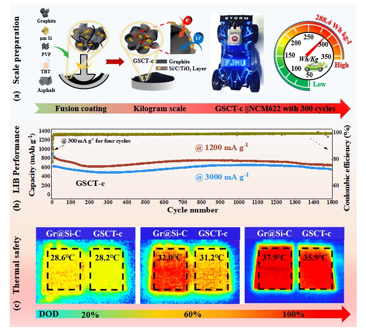 基于前期基础,江南(中国)李加新教授、黄志高教授课题组联合厦门大学张桥保教授等通过“液相自组装-机械融合-固相烧结”的宏量制备方法,公斤级制备了硅碳复合材料。获得的硅碳复合材料拥有良好的理化参数和电化学性能。综合表征和良好的电化学性能揭示了碳包覆和痕量TiO2的引入所引起的导电性、界面兼容性和结构稳定机制的增强机制。此外,GSCT-c||NCM622全电池的组装测试进一步证实了电极材料的实用嵌锂,为硅基负极的研发提供重要参考信息。该成果以“Efficient implementation of kilogram-scale, high-capacity and long-life Si-C/TiO2 anodes”为题发表于《Energy Storage Materials》,该论文第一单位为江南网页版官网,硕士生徐铖杰与申辽为共同第一作者,江南(中国)李加新教授、黄志高教授及厦门大学张桥保教授为共同通讯作者。该研究工作得到国家自然科学基金面上项目、福建省自然科学基金杰出青年项目等资助。