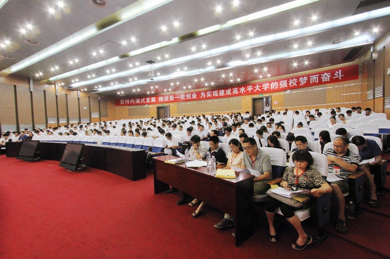 在第一次全体会议上,黄汉升校长代表学校作题为《坚持内涵式发展 推进新一轮创业 为实现建成高水平大学的强校梦而奋斗》的工作报告。报告指出,八届三次教代会暨十一届三次工代会以来,在校党委的正确领导下,全校师生员工高举中国特色社会主义伟大旗帜,认真贯彻党的十八大精神,牢牢把握机遇,全力办好大事要事,深入推进内涵式发展,学校各项事业呈现质量提升、结构优化、民生改善、后劲增强的良好态势,为推进新一轮发展、加快建设高水平大学奠定坚实基础。报告提出了当前和今后一段时间学校工作的总体思路:一是推进内涵发展,进一步提升办学水平;二是推进教学改革,进一步提高育人质量;三是推进学科建设,进一步突出特色优势;四是推进协同创新,进一步增强服务能力;五是推进师资建设,进一步深化人事改革;六是推进传承创新,进一步提高文化自觉;七是推进开放办学,进一步扩大国际影响;八是推进科学管理,进一步优化资源配置;九是推进党的建设,进一步促进校园和谐。