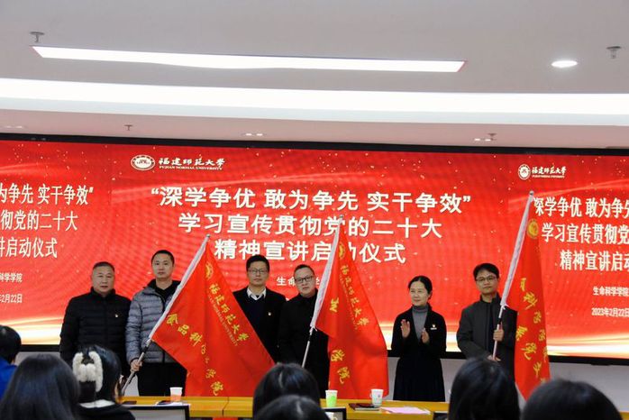 最后,程惠斌副部长、廖元春副书记、付新苗副院长为生物科学系党支部、生物工程系党支部和食品科学与工程系党支部授旗。与会师生党员纷纷表示:将以此次宣讲启动仪式为契机,不断提高政治站位,用心用情用力讲好党的二十大精神,努力做党的创新理论的精准传递者、深入解读者、生动诠释者,在强国复兴道路上贡献生科力量。