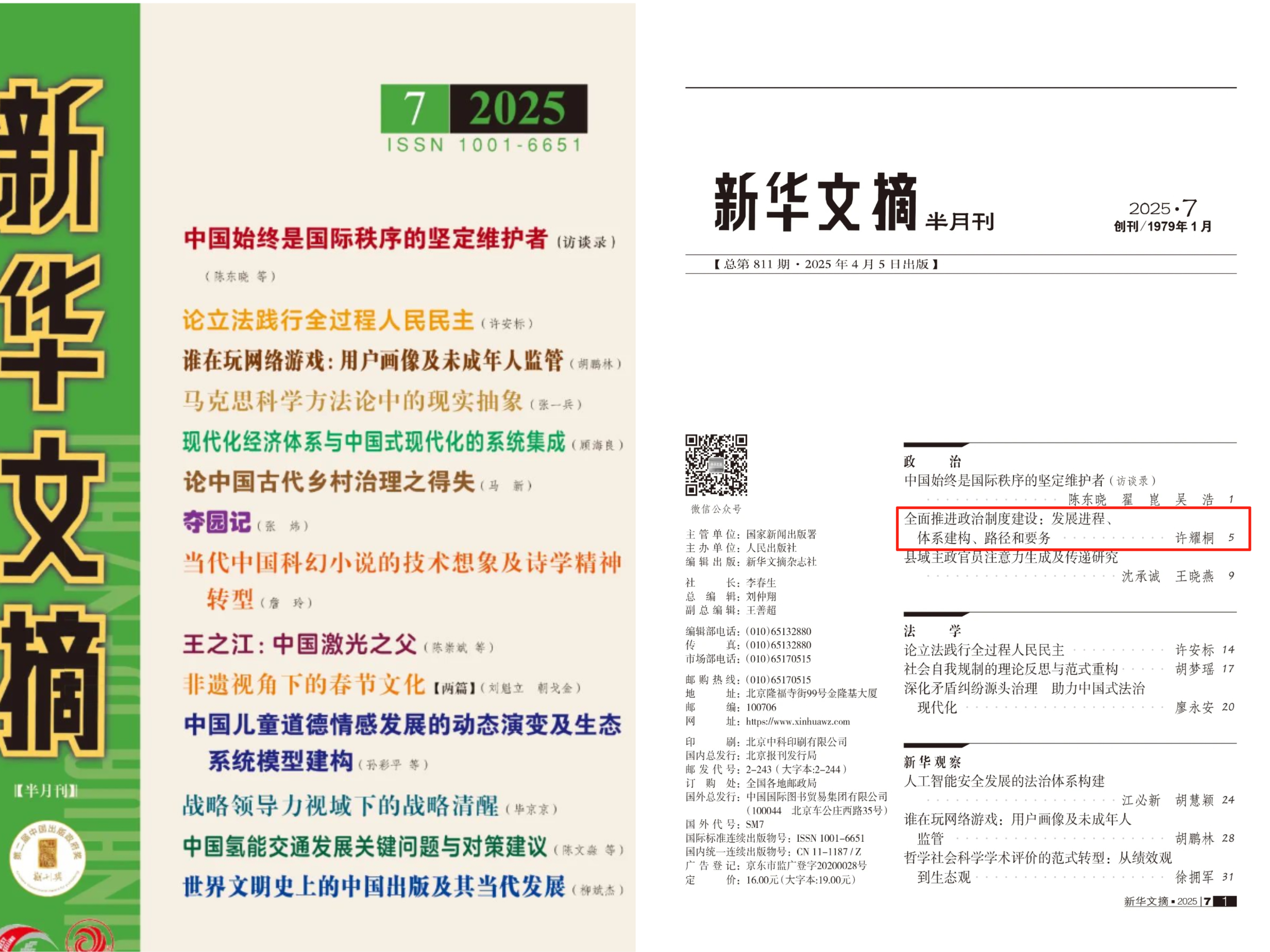 日前,江南(中国)特聘教授许耀桐发表在《新视野》2024年第6期的学术论文《全面推进政治制度建设:发展进程、体系建构、路径和要务》,由《新华文摘》2025年第7期全文转载,字数11000多字。该文同时被人大复印资料《马克思主义文摘》和《中国社会科学文摘》转载。