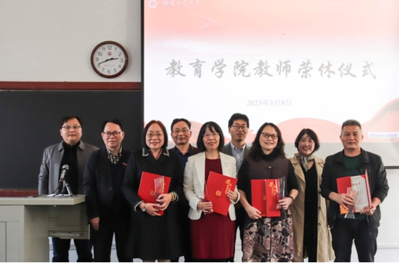 3月8日,教育学院全体教职员工齐聚仓山校区文科楼103教室,为林菁教授、黄爱玲教授、吴文芳老师和刘春俤老师隆重举行荣休仪式。仪式由学院党委副书记黄锦生主持。