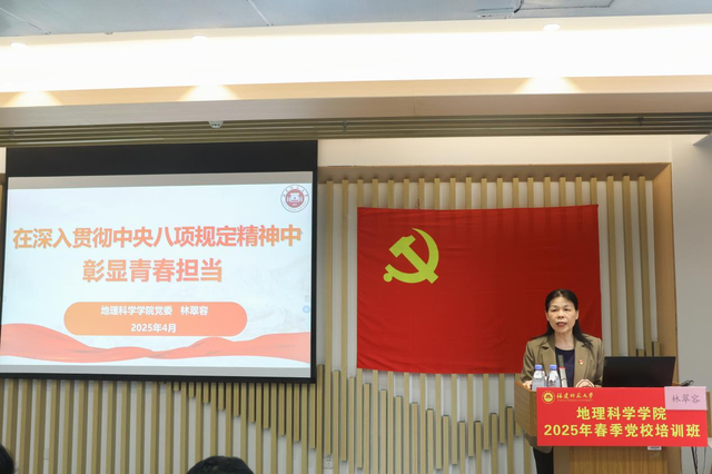 近日,地理科学学院在16号科研实验楼608报告厅举办深入贯彻中央八项规定精神学习教育专题党课,由学院党委书记林翠容主讲。学院党委副书记林伟、部分年轻教师、新提任干部、入党积极分子、发展对象、党员代表参加。