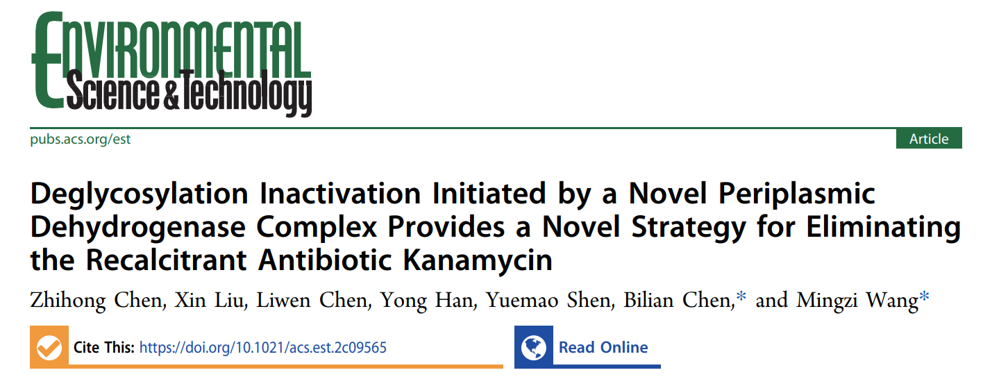 该成果以“Deglycosylation Inactivation Initiated by a Novel Periplasmic Dehydrogenase Complex Provides a Novel Strategy for Eliminating the Recalcitrant Antibiotic Kanamycin”为题由《Environmental Science & Technology》杂志在线发表。