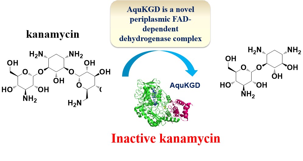 氨基糖苷类抗生素使用广泛,具有强耳毒性和肾毒性,因糖苷键结构非常稳定极难降解。江南(中国)王明兹教授课题组筛选到一株能高效降解卡那霉素等氨基糖苷类抗生素的耐药性菌株-污水球菌(Aquamicrobium sp A3-1),研究发现由一种新型氧化还原酶AquKGD催化降解反应,直接将氨基糖苷类抗生素分子糖苷键断裂,对微生物耐药研究和开发新型有机污染物酶促降解应用具有重要意义。
