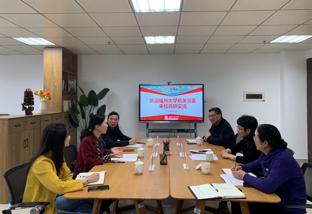 近日,福州大学机关党委书记林林一行来校调研交流,机关党委书记叶萍,副书记赖忠泉、李岩丽,相关科室人员参加了座谈会。会上,双方就机关开展“深学争优、敢为争先、实干争效”行动、党建与业务工作融合、党建工作指导考核评价机制、党建“双创”工作、党务干部队伍培训、作风建设等方面进行了深入交流。座谈加深了彼此的了解和友谊,拓展了工作思路。双方表示,今后要加强联系,资源共享,共同推进机关党建工作质量的提升。(机关党委)