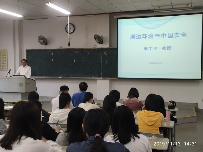 1113日下午于旗山校区致广1-108,校党委讲师团成员、公共管理学院柴宇平教授应邀为社会历史学院师生作“周边环境与中国安全”专题报告。报告由社会历史学院党委副书记钟兴言主持。
