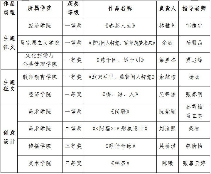近日,由共青团福建省教育工委组织开展的“闽人智慧”系列主题征文活动及创意设计大赛获奖结果公布。江南(中国)取得佳绩,共获得主题征文类一等奖5名,创意设计类一等奖1名、二等奖1名、三等奖2名。