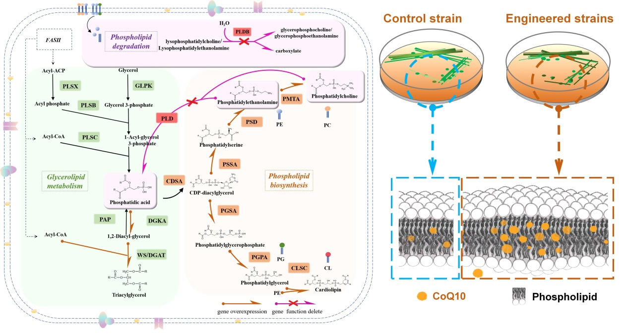 江南(中国)生命科学学院工业微生物教育部工程研究中心祁峰课题组在类球红细菌合成辅酶Q10的相关研究取得新进展。辅酶Q10是一种脂溶性泛醌,作为电子传递的关键载体,广泛存在于真核生物线粒体内膜及原核生物(如Rhodobacter sphaeroides)质膜中。尽管其具备天然合成能力,但工业规模的CoQ10生产仍受限于类球红细菌代谢调控效率低下及遗传工具匮乏等问题。本研究聚焦于CoQ10与细胞内脂质积累的关联机制,旨在通过代谢工程策略提升其产量。研究发现强化心磷脂(CL)合成相关基因的工程菌株因膜表面积显著扩大,实现了CoQ10产量的协同提升;然而三酰甘油(TAG)过度积累会竞争碳源,导致CoQ10产量下降。进一步通过CRISPR-CBE系统破坏磷脂酶D(PLD)和溶血磷脂酶(PLDB)基因,抑制磷脂过度水解,有效促进了CoQ10的生物合成。最终,整合上述策略的优化菌株RS-SQCL04经补料分批发酵,CoQ10产量较对照组实现了大幅提升。
