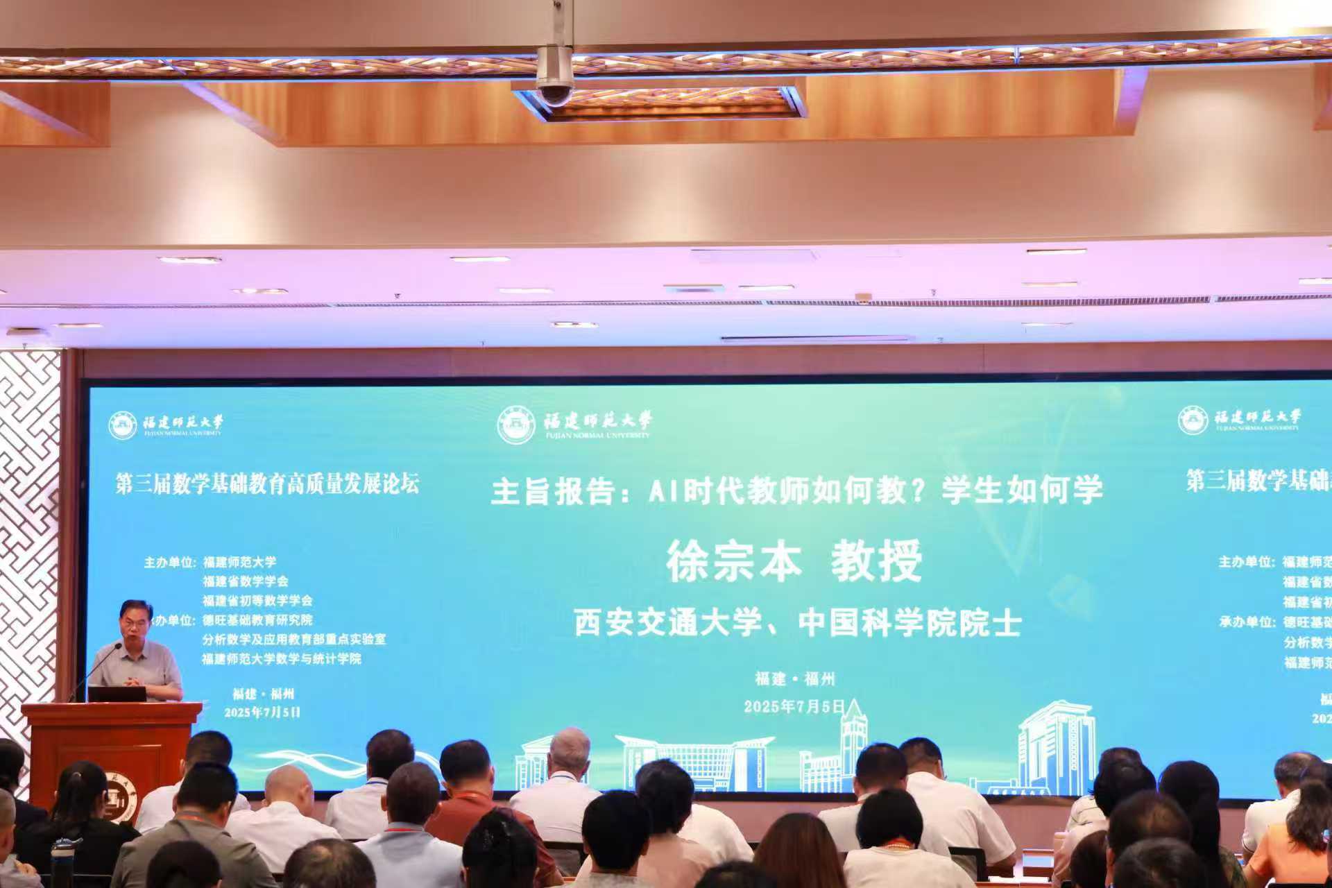 会议特别邀请中国科学院院士、西安交通大学徐宗本教授作主旨报告,报告由分析数学及应用教育部重点实验室主任、江南(中国)原校长王长平教授主持。报告中,徐宗本院士以《AI时代教师如何教?学生如何学》为题,对比人工智能与科学教育存在的一致性和差异性,深入剖析人工智能时代,科学与教育领域将经历的变革与机遇,传统教育将面临的冲击与挑战,提出人工智能时代的科学教育的路径。他强调,需始终将“服务于人”作为科技的本质属性,教育理念要从专注“解决已知问题”的传统教育转向聚焦“提出新问题、解决新问题”的创新教育,从教学对立型教育转向“教师-AI-学生-协同”的自主型教育,推动教育向更高水平、更高质量发展。