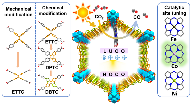 近日,江南(中国)张亮亮副教授课题组合成了一种基于四苯乙烯的柔性Zr-MOF(PCN-128),并以PCN-128为平台展开化学与机械双重改性修饰,期望提升材料在光催化CO2还原活性。机械力诱导压致变色行为,而连续的合成后环化反应扩展了PCN-128内芳香配体的π共轭,将PCN-128转化为PCN-130,显著调节了材料的能带结构与可见光吸收能力。在整个PSM过程中实现了单晶到单晶的转变,为深入理解构效关系提供了重要依据。此外,将金属酞菁的羧基配体(M-TcPC,M=Fe、Co、Ni)引入框架中,提供了额外的催化位点,进一步提高了CO2还原活性。通过优化光敏剂与催化位点的比例,改性催化剂在可见光照射下实现了高达838μmol·g-1·h-1的CO2还原速率。本研究强调了柔性MOFs材料机械和化学改性的潜力,系统揭示了MOFs柔性在能带调控与催化性能优化中的关键作用,为柔性MOFs材料在太阳能转化与可持续能源发展中的应用提供了新思路。该工作以“Chemical and Mechanical Modifications of Flexible Metal-Organic Frameworks for Enhancing Photocatalysis”为题发表于Chemical Science上。