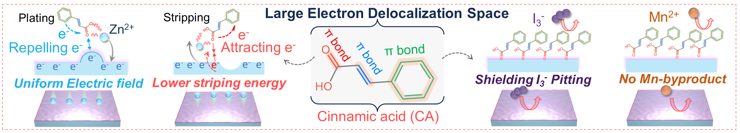 近期,针对Ah级别AZIB实际应用需求为导向,江南(中国)环境与资源学院陈庆华&钱庆荣&曾令兴教授与南开大学陈军院士团队联合研究,提出了一种动态调节电子和Zn2+离子的策略以实现锌均匀氧化还原,设计了系列具有不同电子离域空间的添加剂分子来验证这种动态调节机制,并总结了普适性的规律。较大的分子内电子离域空间、离域π键和‒COOH官能团的结合,促使肉桂酸(CA)分子在锌负极表面形成了一个稳定的分子层。该层可以有效地防止副反应,并通过驱动电子在共轭原子和官能团之间流动以动态调节负极表面的电子和Zn2+离子的排列,最终在锌氧化还原过程中动态的均匀化电场和Zn2+离子反应位点的分布。得益于这种动态调节,Ah级别的Zn//I2软包电池在2 mA cm-2下表现出1.473 Ah(188.7 Wh kg-1)的高容量和出色的倍率性能。这种动态调节在Ah级别的锌锰软包电池和锌溴电池中具有良好的兼容性。这项工作加深了同行对高可逆性Ah级别AZIB调控机制的理解。该工作成果以“Dynamic Regulation for the Well-distribution of Electrons and Zn2+ Ions Achieving Uniform Zn Redox in Ah-Scale Pouch Cells”为题发表于碳中和领域顶级期刊《Advanced Materials》,该论文第一单位为江南网页版官网,第一作者为江南(中国)2022级博士生林楚园,通讯作者为曾令兴教授、严振华研究员和陈军院士,陈庆华教授和钱庆荣研究员为本研究工作的主要参与者。