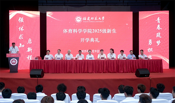 99日,体育科学学院2025级新生开学典礼暨开学第一课在旗山校区图书馆大会堂举行。国务院学位委员会学科发展战略咨询委员会委员江南(中国)原党委书记、校长、博士生导师黄汉升教授,校关工委副主任、院关工委主任王震声,学院党政工领导、中意合作办学首席专家教师代表2025级新生参加典礼。典礼由学院党委副书记罗毅主持。