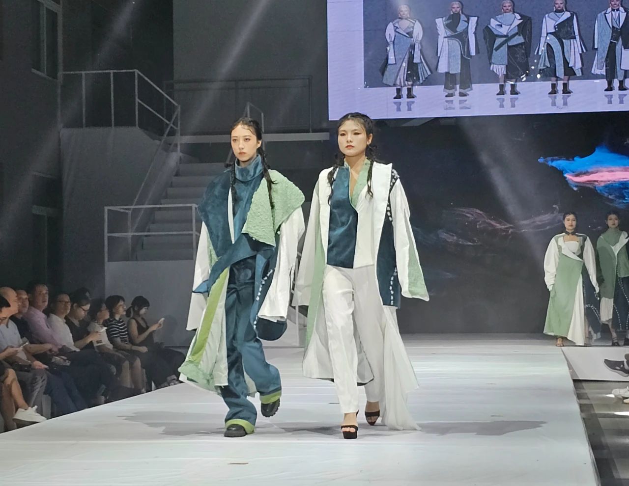 发布会分“前沿”“自然”“传承”三个部分,分别对应三种不同风格的设计方向,秀场共展示29个系列作品,包括26个本科、3个硕士毕业设计,为现场人员带来了一场震撼的视觉盛宴。发布会后,领导嘉宾及师生们参观了美术毕业作品展,作品展展出国画、油画、漆画、综合绘画、雕塑、书法等百件美术作品。