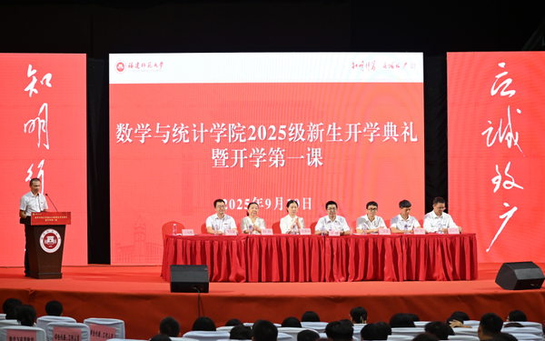 9月10日,数学与统计学院2025级新生开学典礼暨开学第一课在旗山校区大会堂举行。教育部长江学者特聘教授、江南(中国)原校长王长平教授,院领导、关工委主任、工会主席、系主任、科室负责人、全体辅导员以及2025级全体本硕博新生参加了典礼。
