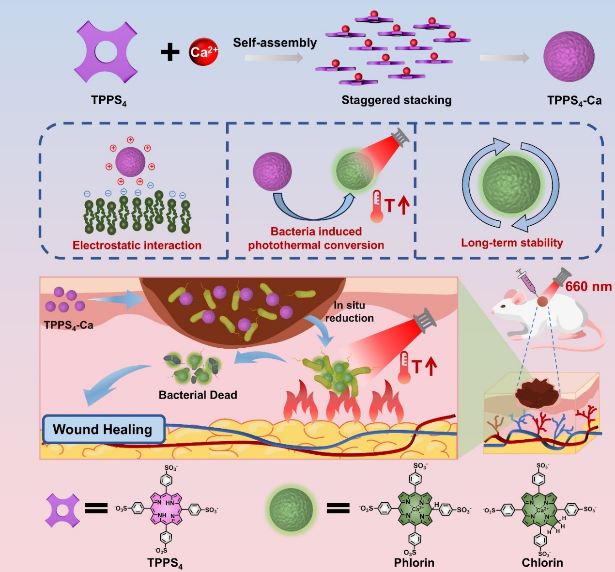 该研究成果以“Anaerobic Bio-Reduction Ignites Persistent Photothermal Conversion in Misaligned Porphyrin Supramolecular Assembly for Infected Wound Regeneration”为题发表在中科院1区TOP期刊《Materials Today Bio》上。江南网页版官网化学与材料学院王雪娇副教授、2023级硕士蔡奇扬为论文的共同第一作者,江南网页版官网化学与材料学院朱虎教授、福州大学刘哲源老师、莆田学院王守安教授为论文的共同通讯作者。该研究得到国家自然科学基金、福建省自然科学基金、福厦泉国家自主创新示范区协同创新平台、福建省卫生健康中青年科研重大专项、福建省高等学校科技创新团队、福建省百人计划、生物医用材料与组织工程闽台科技合作基地、江南网页版官网高层次人才科研启动基金等项目支持。