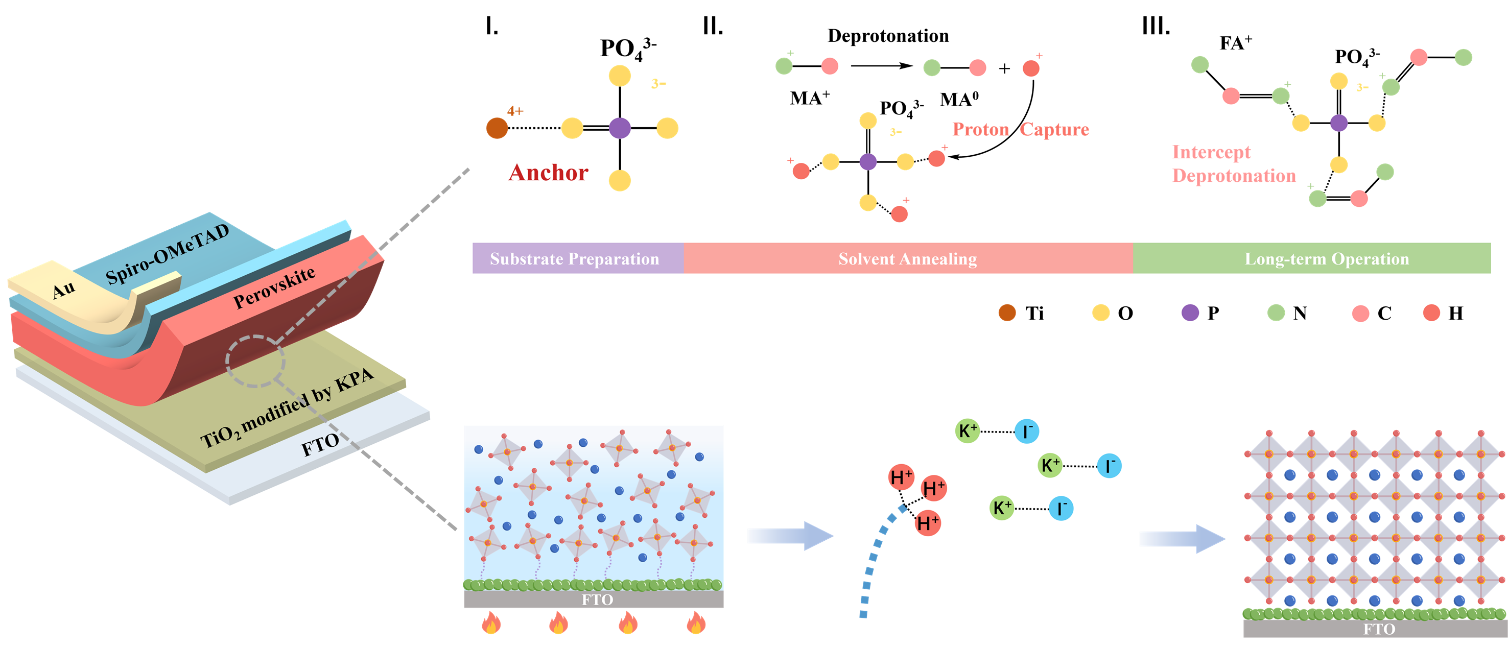 为了应对这一挑战,我校物理与能源学院卫东副教授团队提出一种质子-离子捕获(PIC)策略,通过在埋底界面引入无机磷酸盐来抑制界面质子转移和卤素迁移。PO43−捕获质子并与有机阳离子配位,同时释放的K+与I−配位,形成协同的离子环境,从而抑制与质子转移相关的降解途径并稳定钙钛矿结构。实验数据表明,该策略可抑制界面孔洞、促进晶体定向生长并缓解钙钛矿薄膜中的残余应变,而实验与理论分析均证实界面缺陷减少。优化后的界面能级对齐及界面载流子传输效率的提升也得到验证。因此,冠军钙钛矿太阳能电池实现了25.1%的功率转换效率(PCE),且开路电压损失极低,仅为0.35V。所制备的器件长期稳定性增强,在连续光照800小时(ISOS-L-1)后保持了初始效率的89.6%。