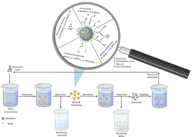 文章系统梳理了利用微生物合成纳米材料并高效回收稀土元素的最新进展,细菌、真菌等微生物可在胞内或胞外原位生成表面功能化纳米颗粒,显著提升稀土吸附容量与选择性,相较于物理化学法,微生物合成在绿色指数、粒径控制及规模化潜力方面更具优势;提出了将现场微生物群落升级为“活的纳米反应器”的新思路,可在废水源头同步完成污染削减与稀土富集,预计稀土回收率可提高30 %以上,为稀土资源的闭环循环与矿区生态修复提供了前瞻路线图。未来需进一步突破菌种筛选、纳米颗粒再生与工艺放大三大瓶颈,以推进实际工程应用。