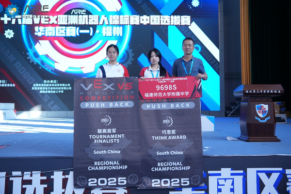 近日,由亚洲机器人联盟慈善基金主办的2025第十六届VEX亚洲机器人锦标赛中国选拔赛华南区赛”在福州第三中学滨海校区举办。来自粤桂闽琼地区的近400支优秀赛队参赛。附属中学队号为9698S的参赛队伍(学生:郑雨薇、叶玥童,指导教师:夏洪江)赢得联队赛亚军,同时获评巧思奖。