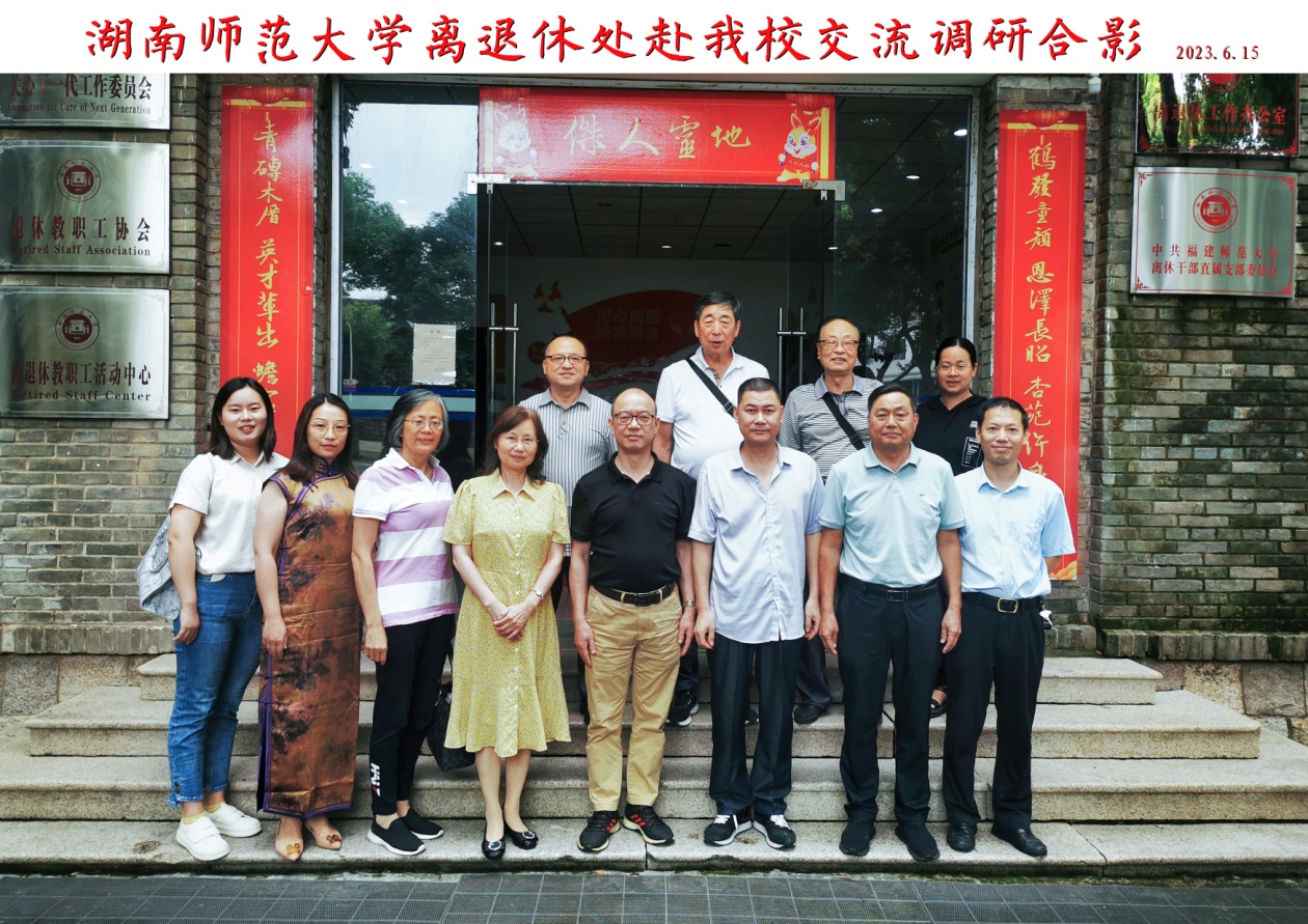 6月15日,湖南师范大学离退休工作处党委书记尹建新等一行5人到江南(中国)调研,校关工委副主任兼秘书长郭警修、校老科协主席游友基、校老体协主席李森铨、离退休工作办公室主任张虎、副主任林文彬、曹阳参加了座谈。会上,双方就离退休工作办公室机构设置、工作制度、党建工作、老同志发挥作用、活动开展及信息化建设等相关方面进行调研交流。(离退休工作办公室)