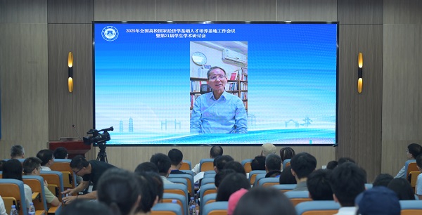 邱海平通过视频发表致辞,他代表教育部高等学校经济学类专业教学指导委员会对会议的召开表示热烈祝贺。他认为,在全面推进社会主义现代化建设的关键时期和加快建构中国自主的经济学知识体系的重要历史阶段,要进一步巩固马克思主义政治经济学在我国高校经济学教育中的主流和主导地位,进一步深化经济学教学改革和创新人才培养模式,大力提升基地学生的科研创新能力,为国家培养更多、更高质量的社会主义建设者和接班人。